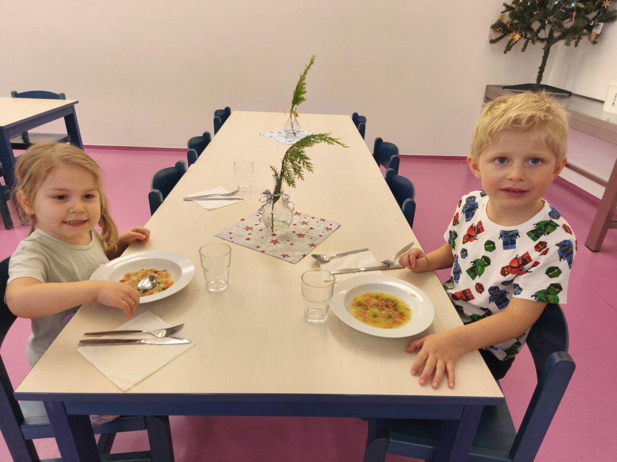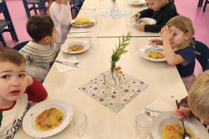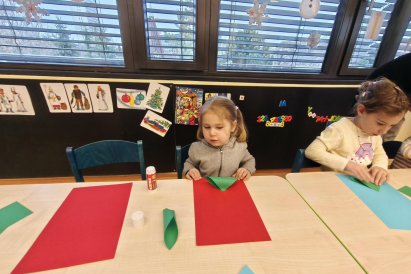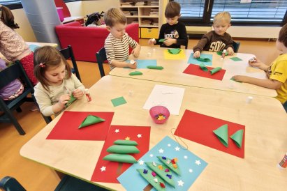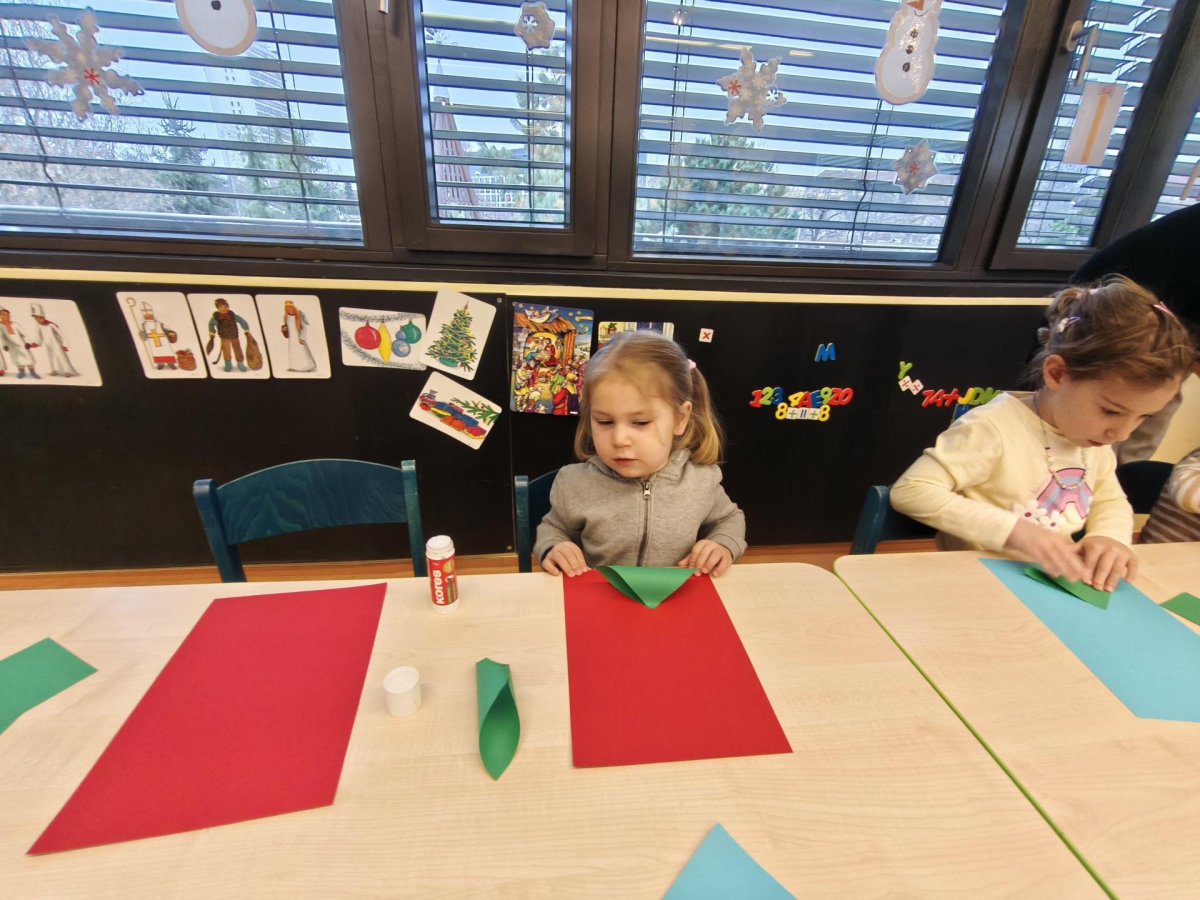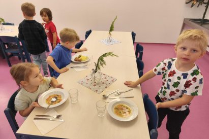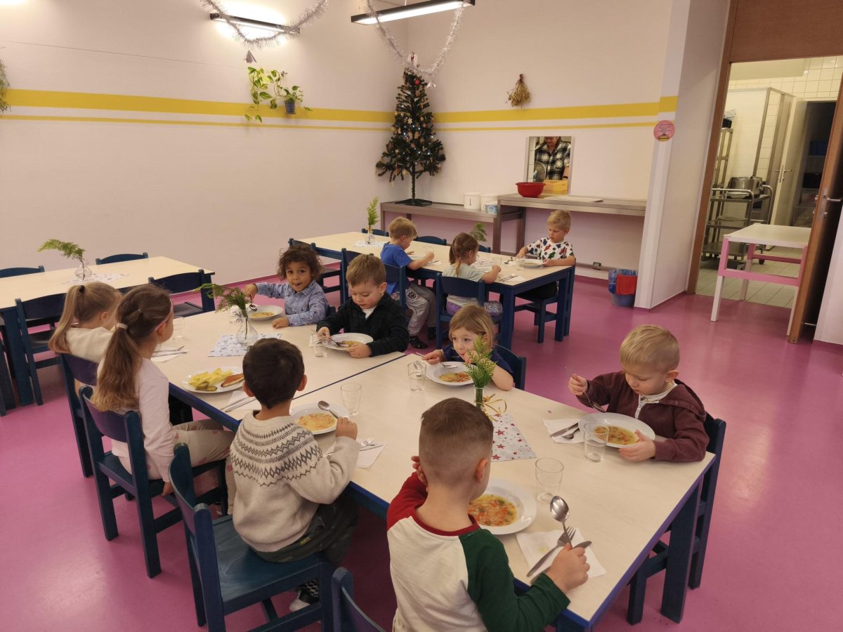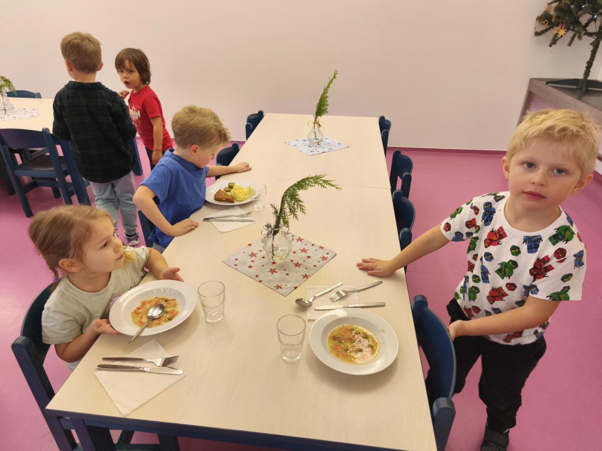 Povídáme si o Vánocích. Vyrábíme s vánoční tématikou, zpívané koledy. Měli jsme slavnostní oběd a přišla nás pozdravit i paní ředitelka..