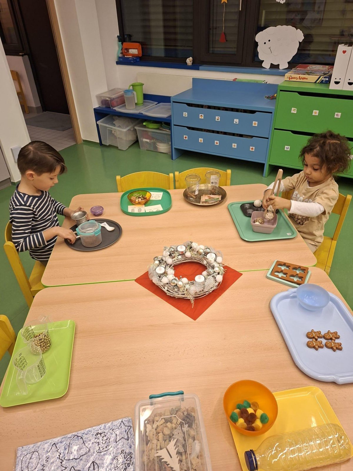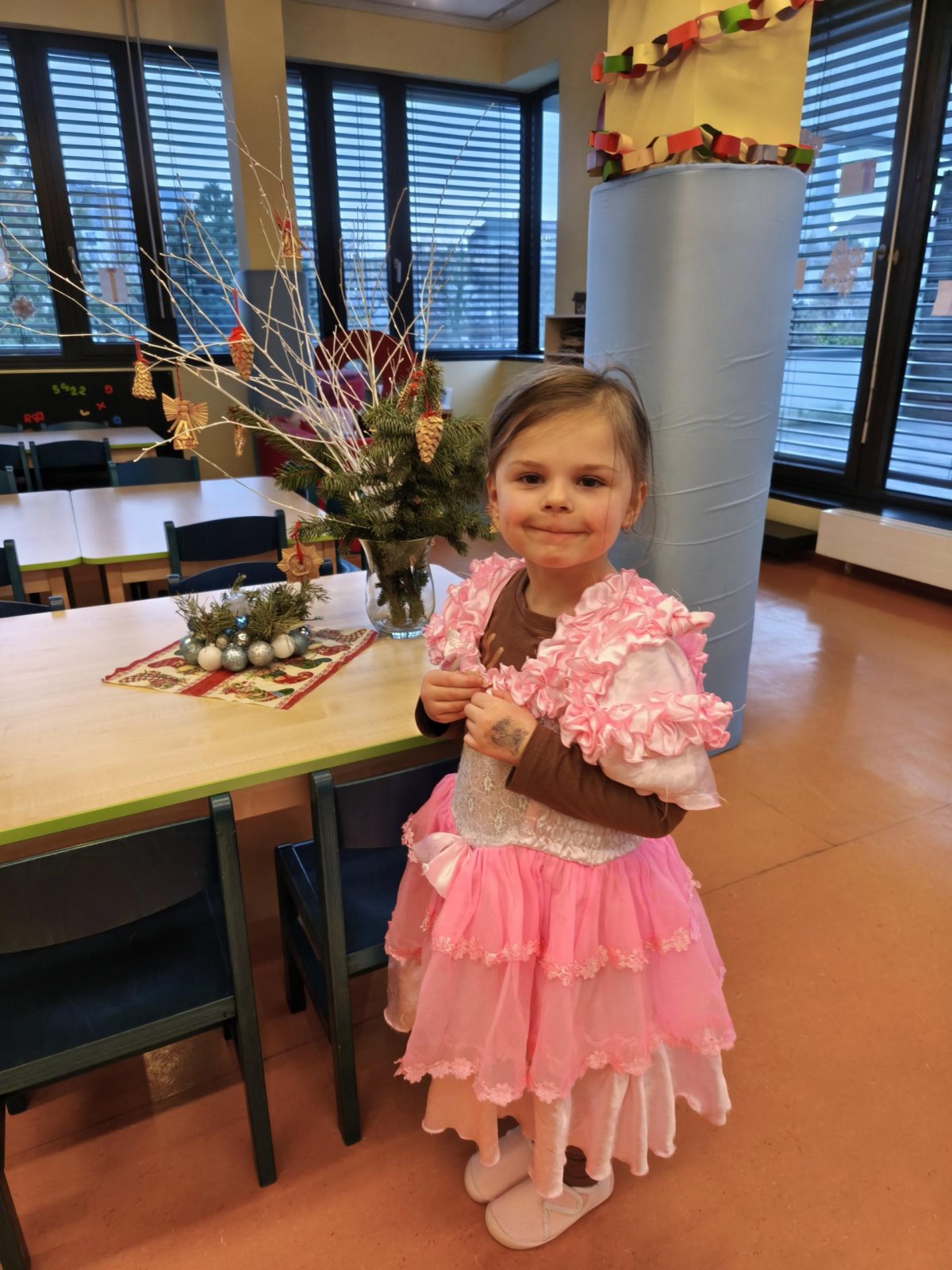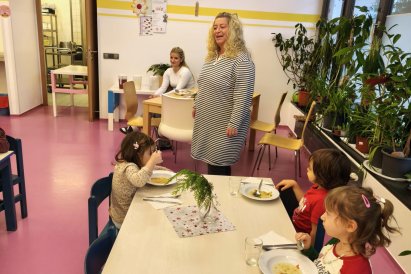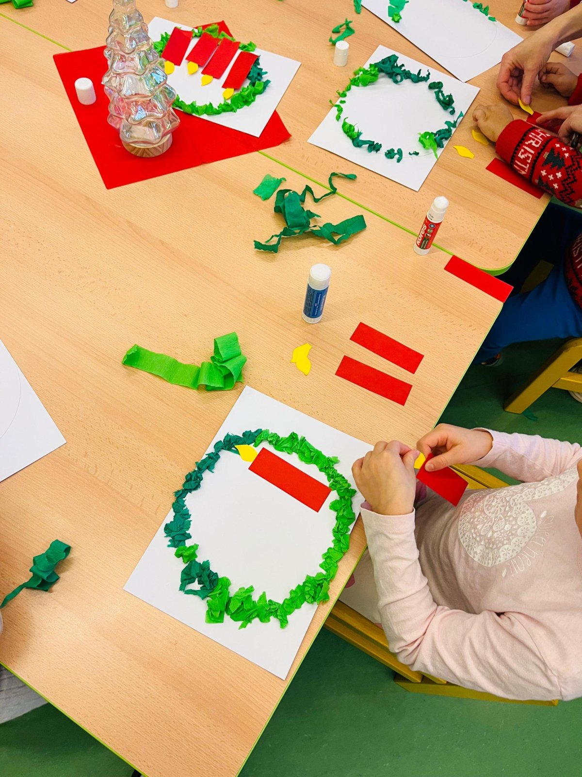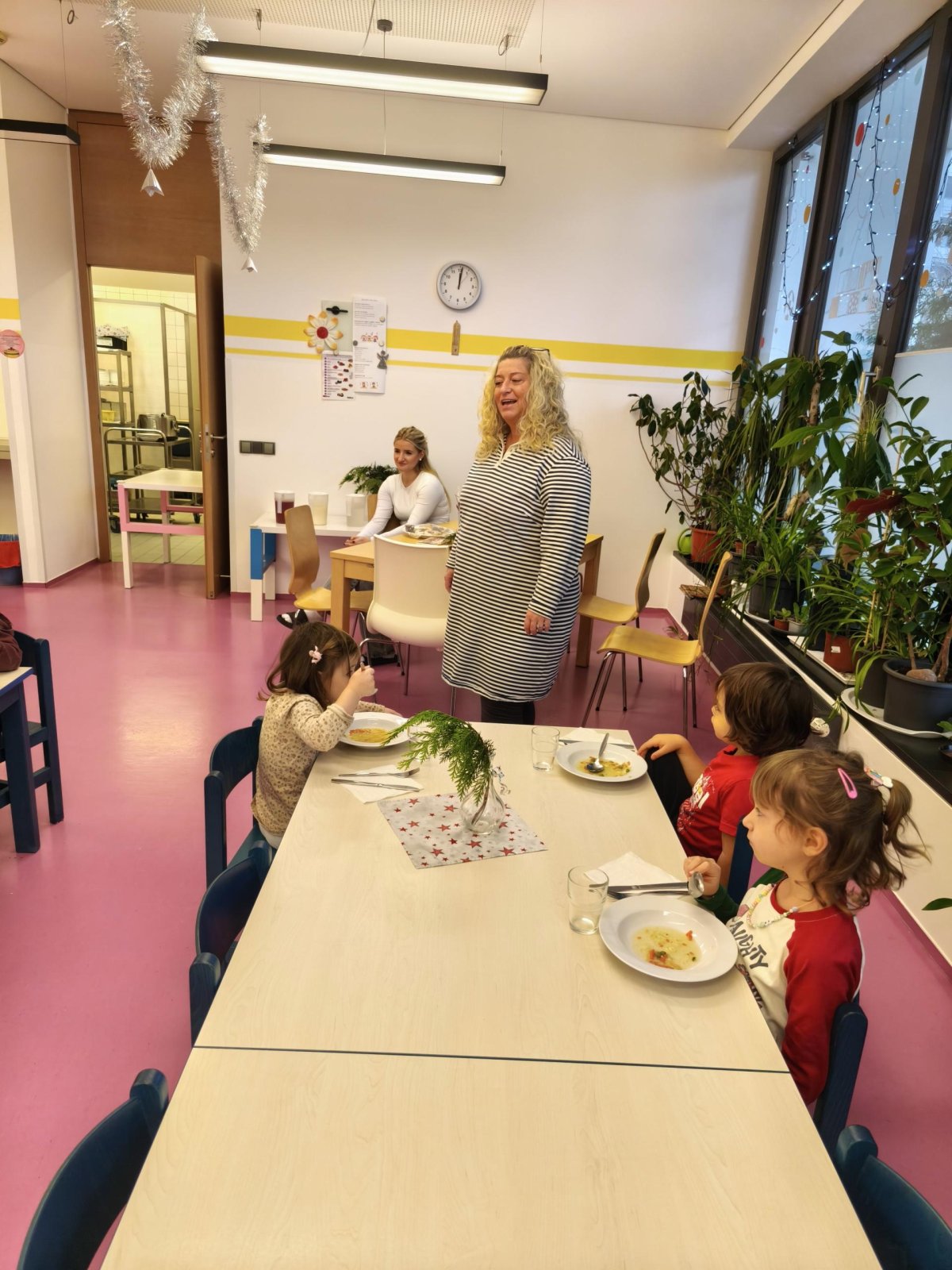 Povídáme si o Vánocích. Vyrábíme s vánoční tématikou, zpívané koledy. Měli jsme slavnostní oběd a přišla nás pozdravit i paní ředitelka..