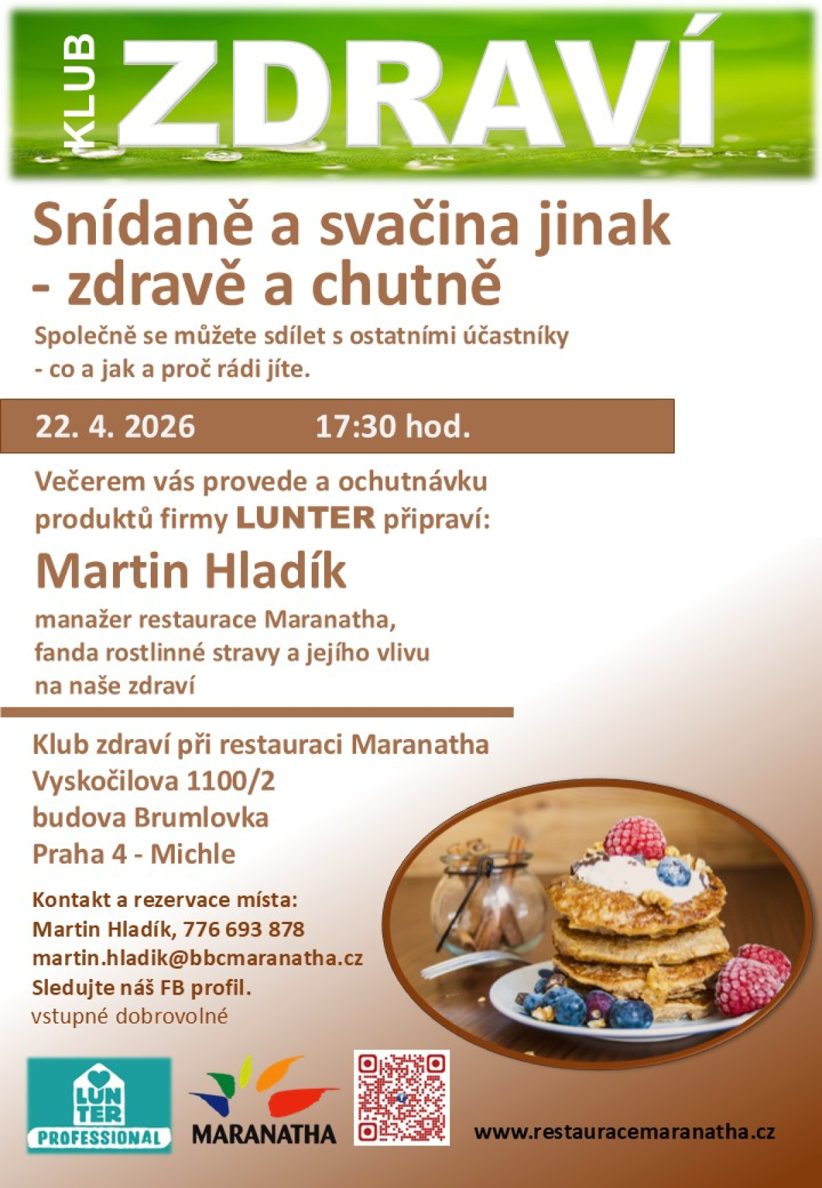 Restaurace Maranatha Vás zve na Klub zdraví, který se bude konat 22. 4. 2026 od 17:30 hod.
